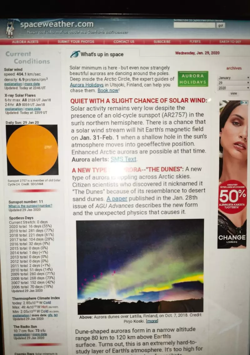Totuttuun tapaan kävin ohimennen vilkaisemassa repoarvoja space weatherin sivustolta. Klikkasin linkin auki ja siinä etusivulla oli ottamani dyynikuva!! Se olotila, mikä uutisen ja kuvan näkemisestä seurasi oli sanoinkuvaamaton. Yht'äkkiä yksikään ulkona valvottu ja värjötelty yö ei tuntunut turhalta. Yksi suurimmista unelmistani on ollut päästä Space Weatherin etusivulle. Illalla tuli jymyuutinen, Chris Ratzlaff liittyi Fb ryhmäämme eli revontulikyttääjiin. Chrisin nimi oli todella tuttu, häneltä on netissä valtavasti toinen toistaan upeampia revontulikuvia ja nimenomaan dyyneistä, kuvattuna vain maailman toiselta puolen. Siinä kohtaa tuntui huikealta. Alberta Aurora Chasers -ryhmästä tulvi onnitteluja Suomalaiselle, pienelle tiimille. Päivällä oli revontulikyttääjissä niin kova karnevaalitunnelma ettei mitään järkeä. Täytin tehtävääni arkiston tätinä täyttäen mediakaaviota, jokainen julkaistu uutinen piti yrittää kopata.Tiistai aamuna ensimmäisinä uutisina oli päivittynyt space weather dyynikuvalla ja australialainen(!) sanomalehti, joka myös oli noteerannut uutisen!